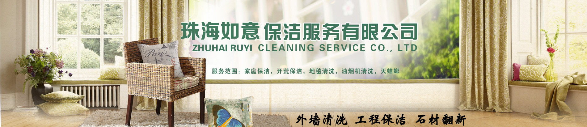 珠海市如意清潔主營:外墻清洗、地毯清洗、石材護理翻新、企業保潔、開荒清潔、屋面防水、油煙管道清洗。家庭保潔,物業保潔,小區物業保潔,樓盤開荒,沙發(fā)清潔,地板打蠟,(建筑、汽車玻璃貼膜)。